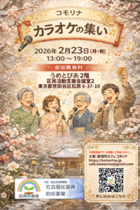 居場所カフェ コモリナ主催でカラオケ大会を開催します。 (当イベントは「WAM(福祉医療機構)社会福祉振興助成事業」となります) ※会場は東北沢の「居場所カフェ コモリナ」ではありません。ご注意ください。 カラオケ会場: […]