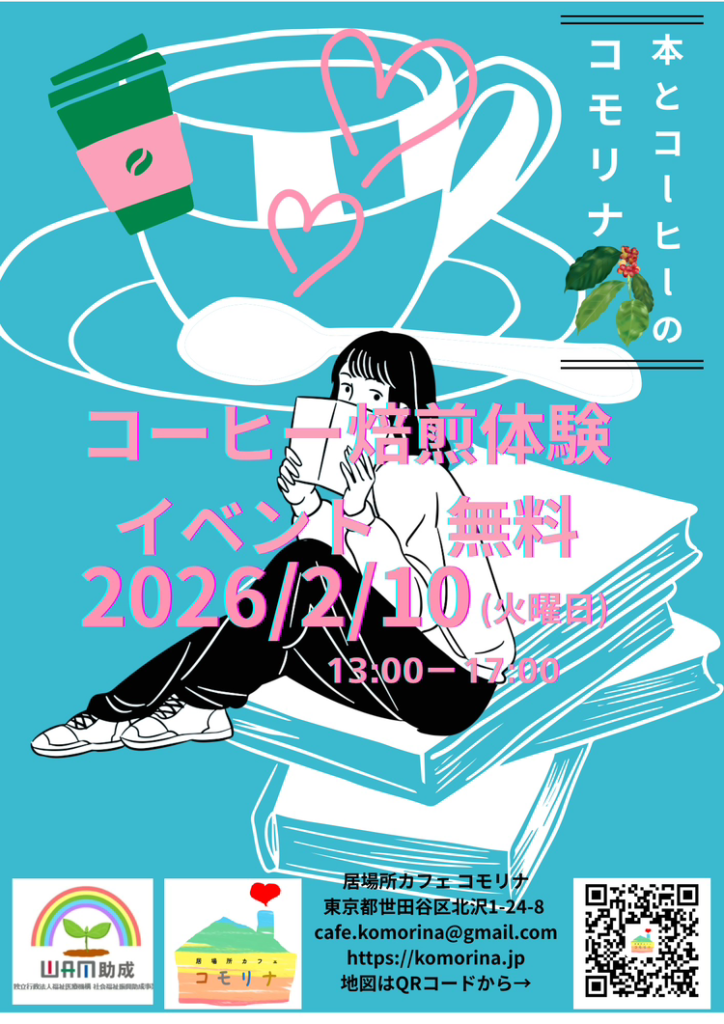 2/10(火)コモリナ珈琲 自家焙煎体験イベント 2026年2月3日 最終更新日時 : 2026年2月3日 komorina 自家焙煎機で生豆から一緒に焙煎をして、コーヒーを飲むイベントです。 焙煎の香りや、同じ生豆でも煎り方で味が変わる体験などをお楽しみください。 日時:2月10日(火)13:00~17:00 場所:コモリナ 1階キッチン 参加費無料です。 どなたでも、お時間内でしたらいつでも、お気軽にお立ち寄りください。 \ 最新情報をチェック / FacebookXBlueskyHatenaCopy