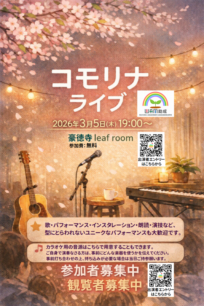 3/5(木) コモリナライブ【出演者エントリーは締切りました】 2026年2月21日 最終更新日時 : 2026年2月22日 てつにい 3/5(木)コモリナライブ開催 豪徳寺 leaf roomにて 18:30から(開催時間が早まりました) 3月5日、コモリナライブにたくさんのエントリーありがとうございます! 現在保留中の方を除いて、締め切りとさせていただきたく思います。 何卒よろしくお願い致します。 \ 最新情報をチェック / FacebookXBlueskyHatenaCopy